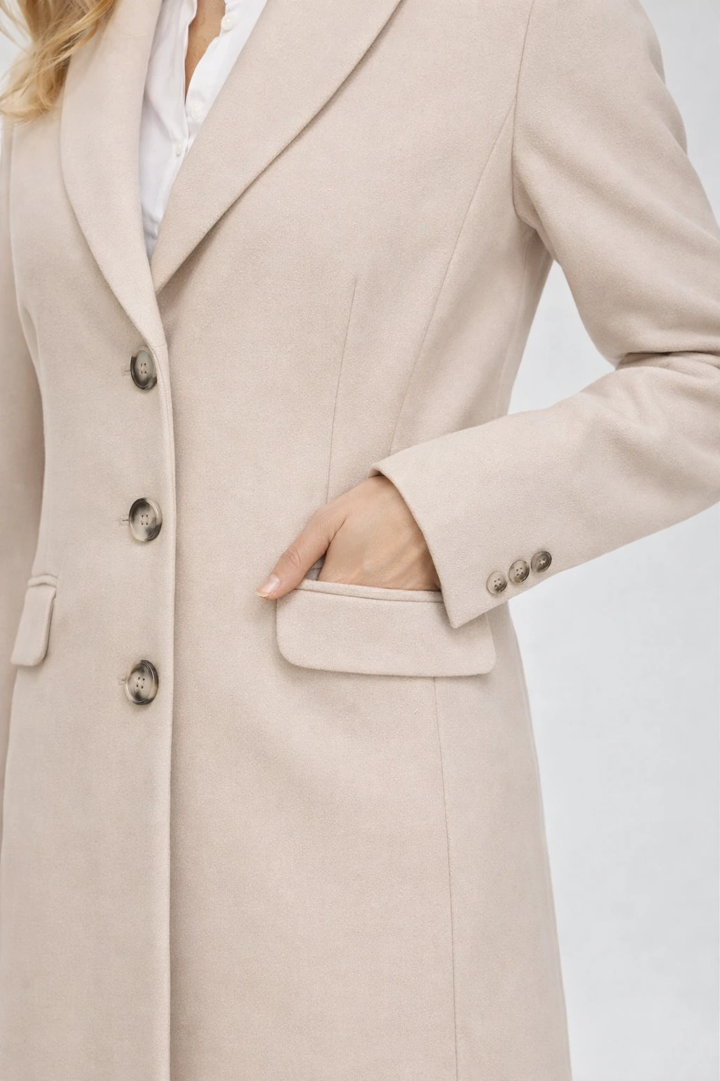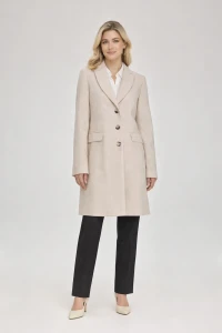 Model zapinany na trzy guziki posiada klasyczny wykładany kołnierz, który podkreśla jego wyrafinowany charakter. Dwie kieszenie z patkami zwiększają funkcjonalność, a podszewka zapewnia komfort noszenia w chłodniejsze dni. Tkanina z dodatkiem wełny sprawia, że płaszcz dobrze układa się na sylwetce i jest przyjemny w użytkowaniu.