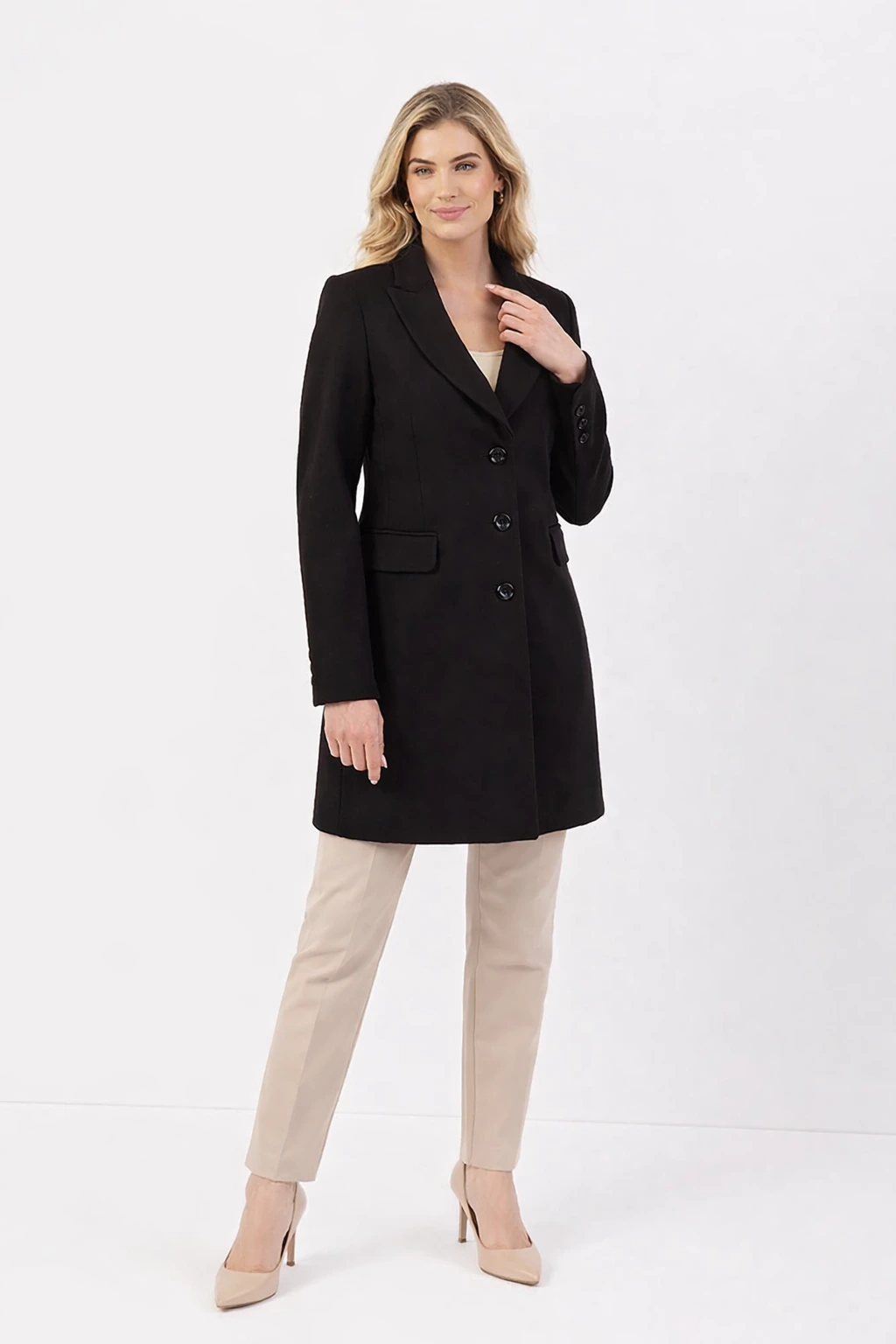 Model zapinany jest na trzy guziki i posiada klasyczny wykładany kołnierz, który podkreśla jego elegancki charakter. Dwie kieszenie z patkami zwiększają funkcjonalność, a podszewka zapewnia komfort noszenia. Starannie dobrana tkanina z dodatkiem wełny sprawia, że płaszcz jest przyjemny w użytkowaniu i dobrze układa się na sylwetce.
