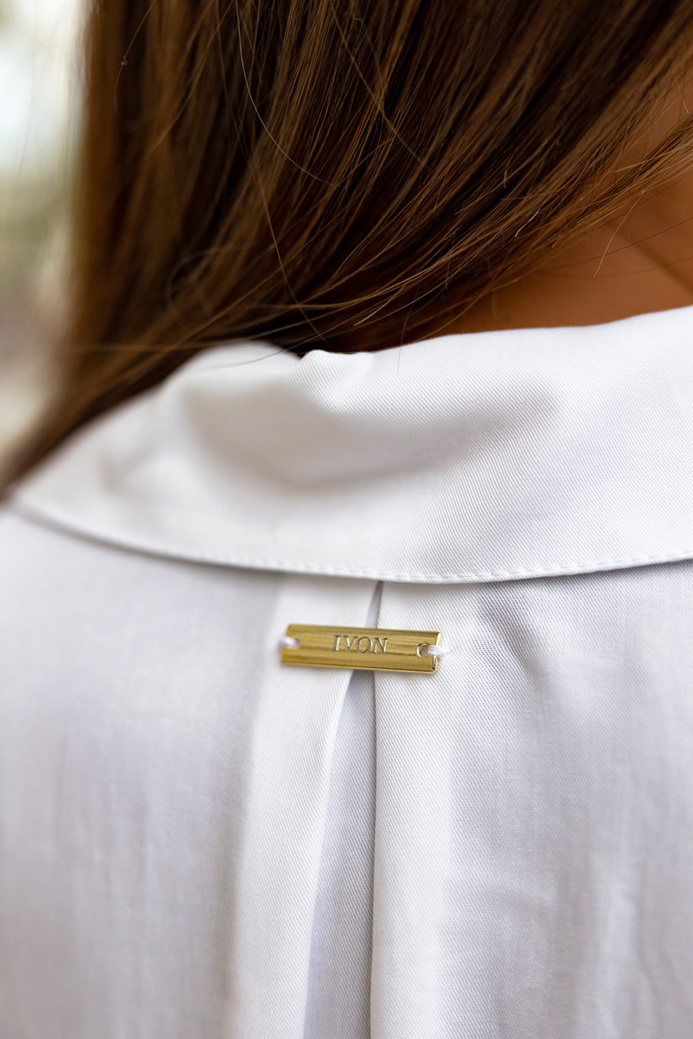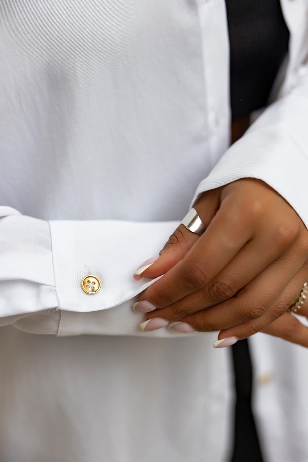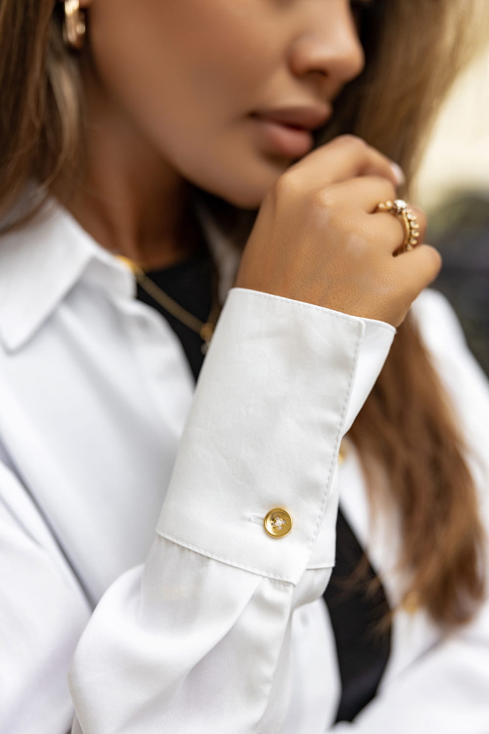 Złote guziki, szerokie mankiety i dyskretne logowanie - przełamują minimalizm koszuli - są niczym idealnie dobrana biżuteria i dodają jej charakteru.