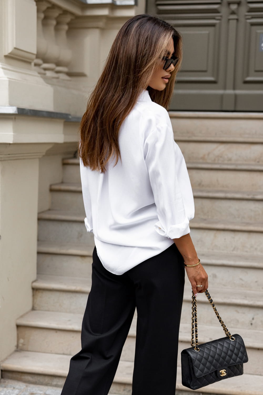 Biała koszula Emilie to klasyczna koszula damska uszyta z gładkiej, jednolitej i oddychającej tkaniny.