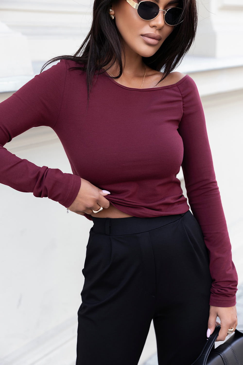 Longsleeve, czyli uniwersalna bluzka z długim rękawem. Opuszczana na jedno ramię z ozdobnym delikatnym marszczeniem.