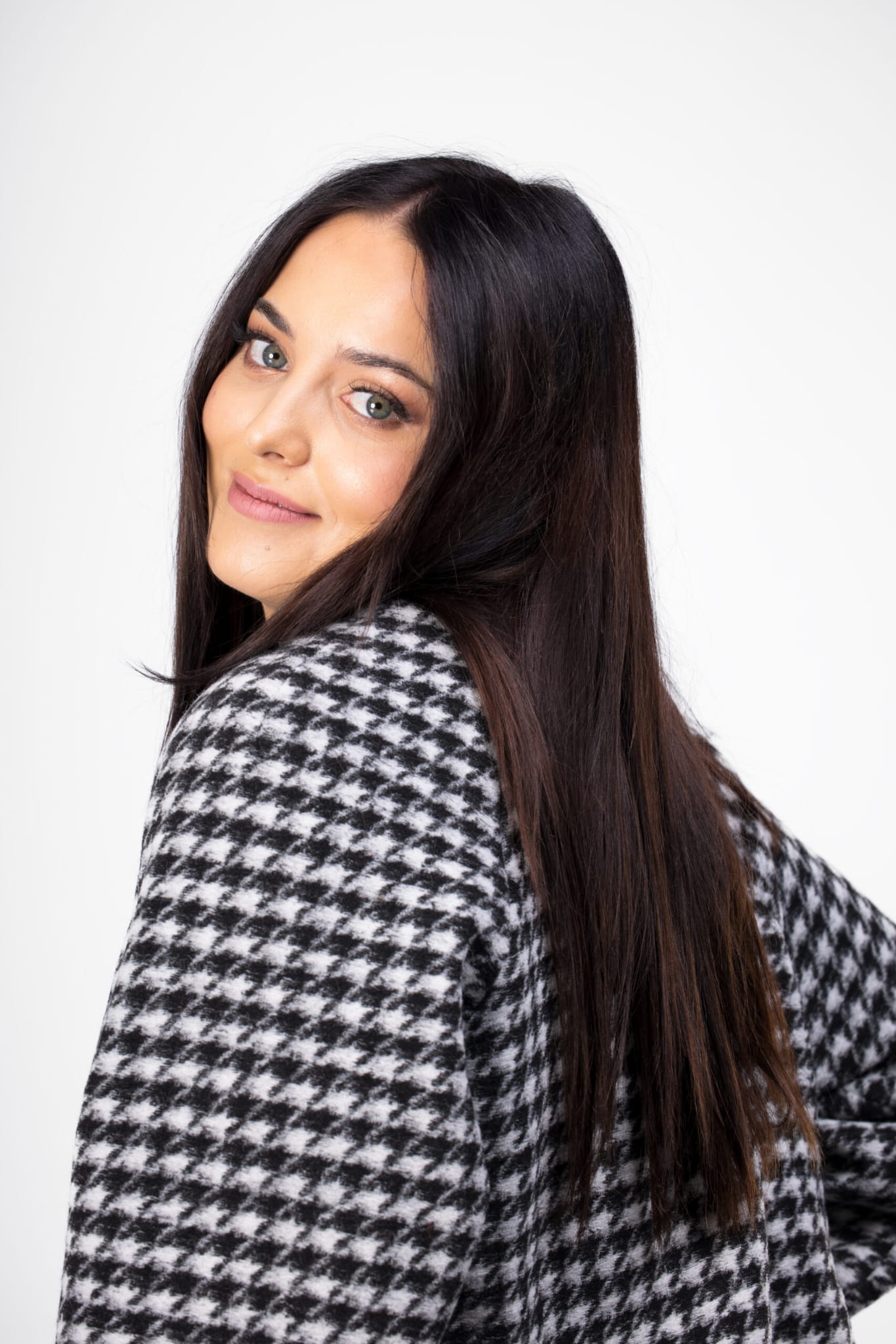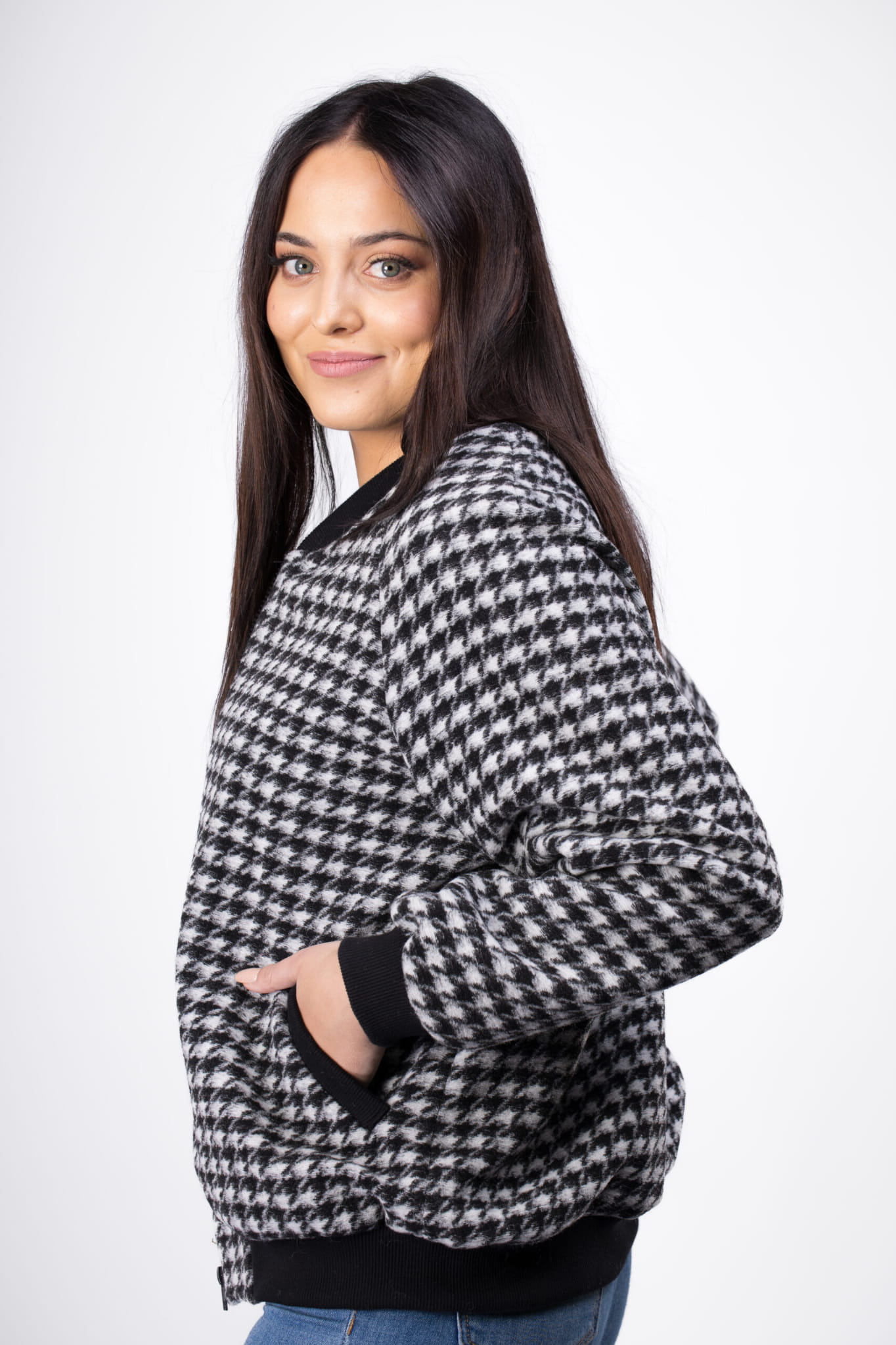 Bomberka w biało-czarną pepitkę zapinana na zamek. Nowoczesny fason w wełnianym wydaniu.