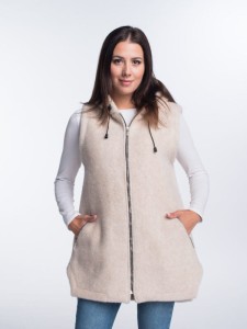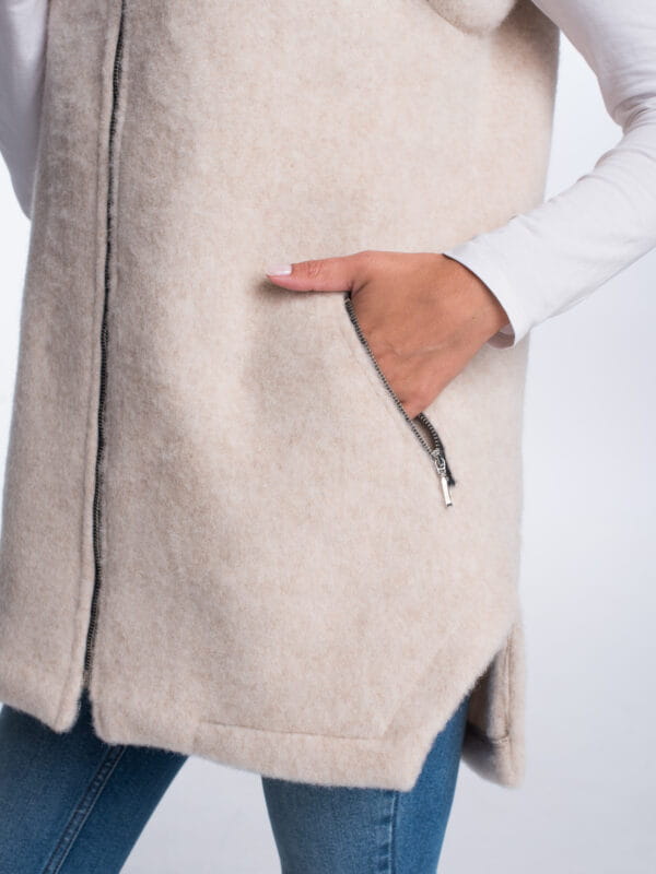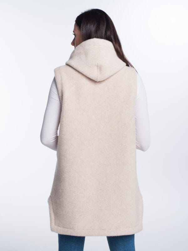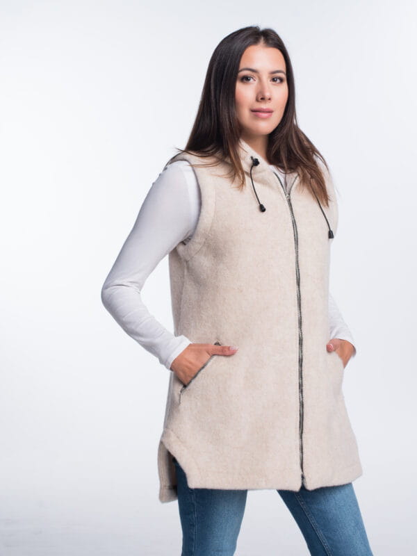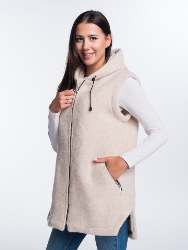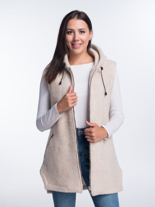 Wygodna i ciepła kamizelka damska wykonana z naturalnej wełny igłowanej, idealna na chłodniejsze dni. Praktyczny, przedłużany krój z kapturem zapewnia komfort i ochronę przed zimnem, a neutralny beżowy kolor pasuje do wielu stylizacji.