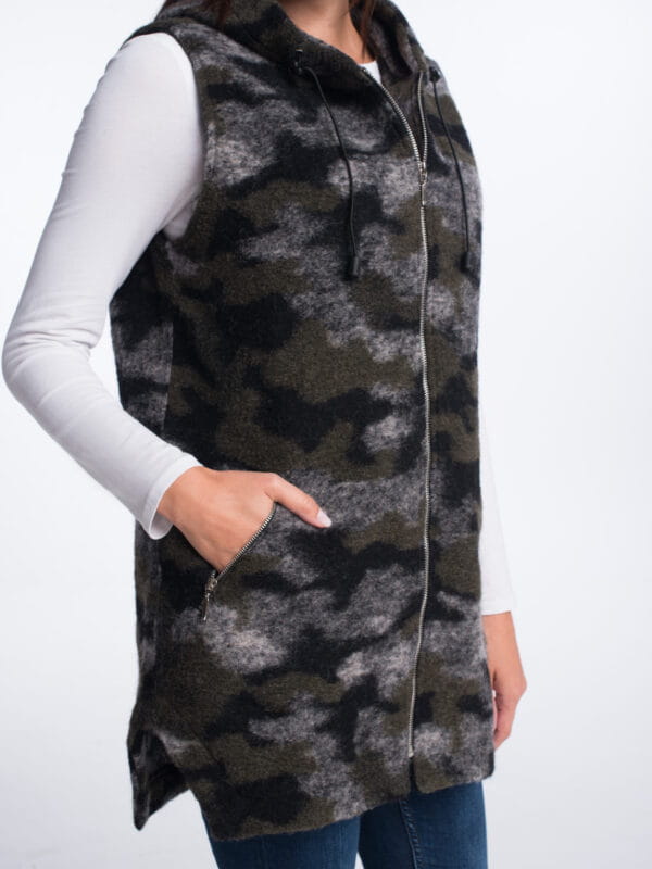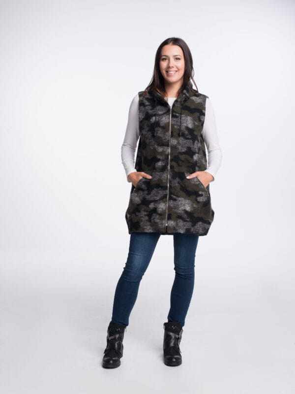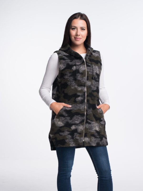 Wygodna i ciepła kamizelka damska wykonana z naturalnej wełny igłowanej, idealna na chłodniejsze dni. Praktyczny, przedłużany krój z kapturem zapewnia komfort i ochronę przed zimnem, a neutralny beżowy kolor pasuje do wielu stylizacji.