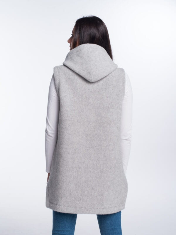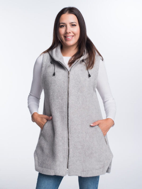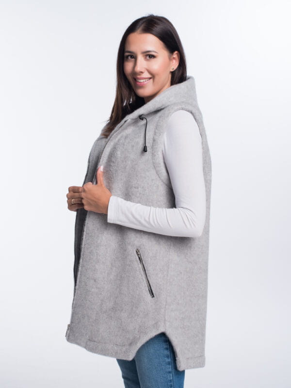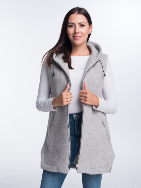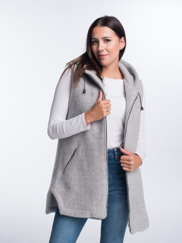 - Ta lekka kamizelka wełniana z kapturem to propozycja dla kobiet ceniących świadome wybory modowe – naturalne materiały, uniwersalny krój i oryginalny styl.