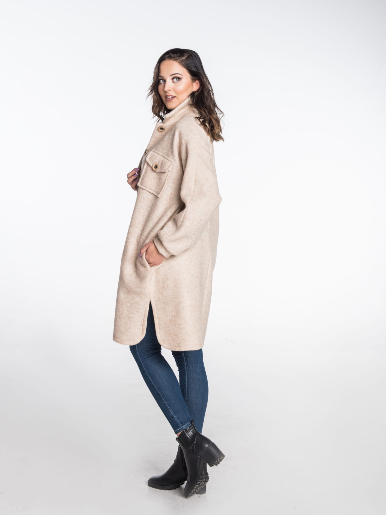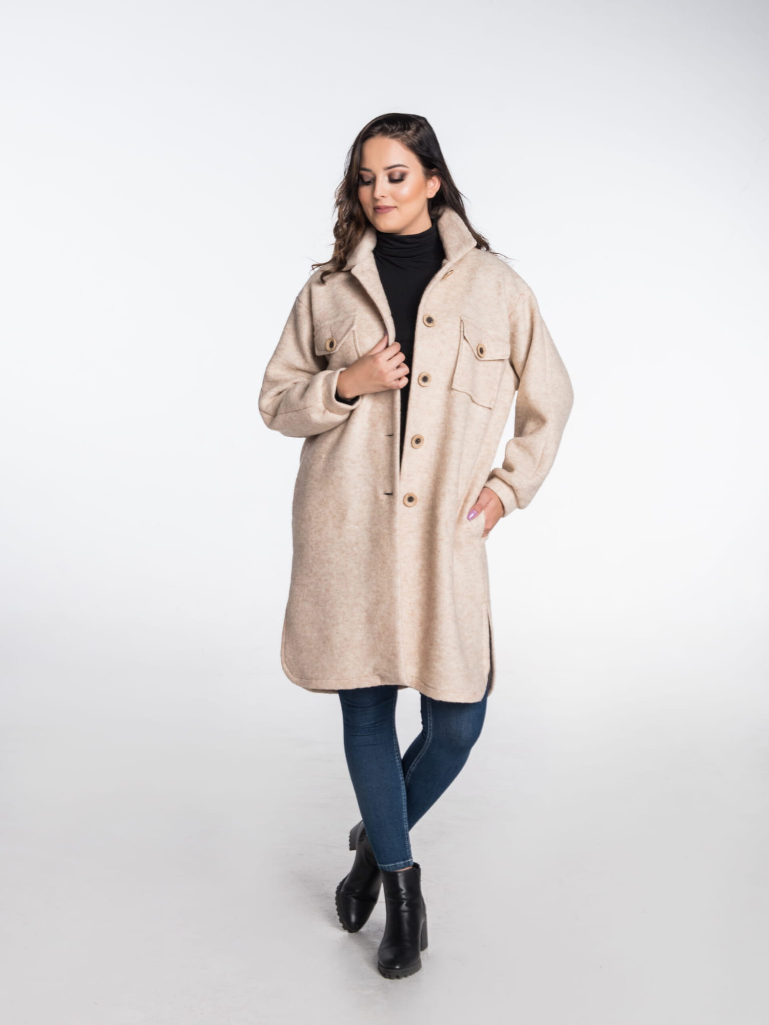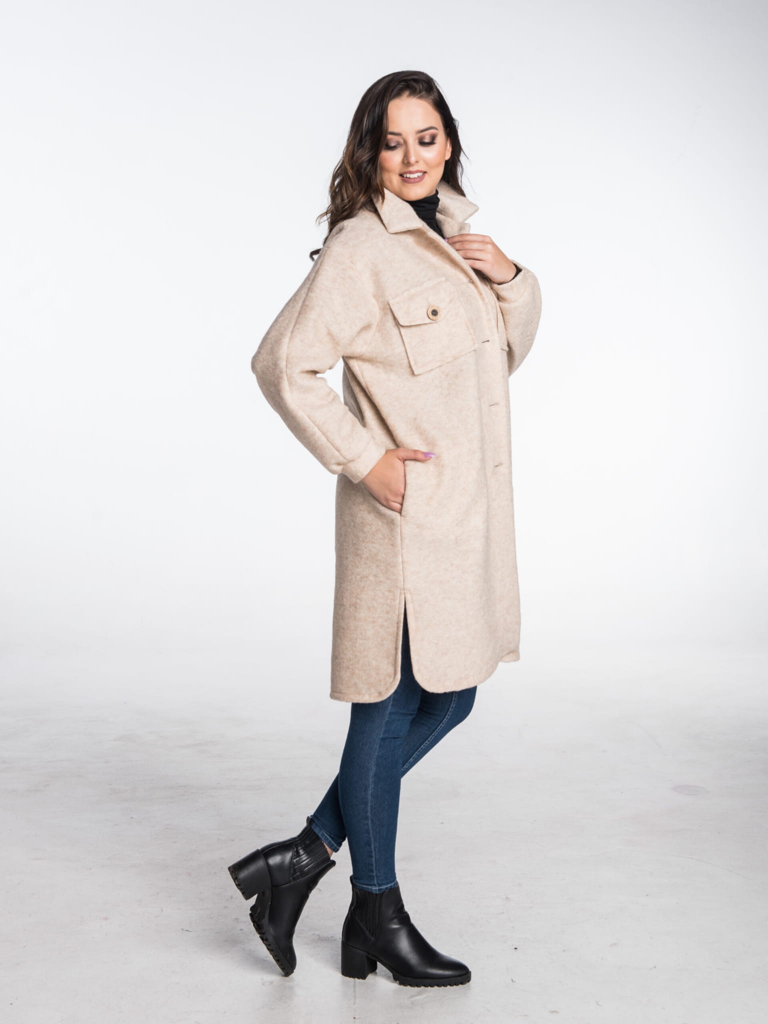 Wygodna i ciepła, długa koszula – płaszcz z przyjemnej 100% wełny w kolorze beżowym.