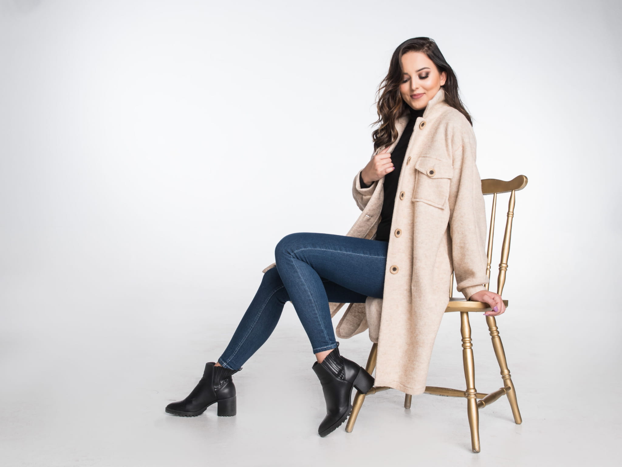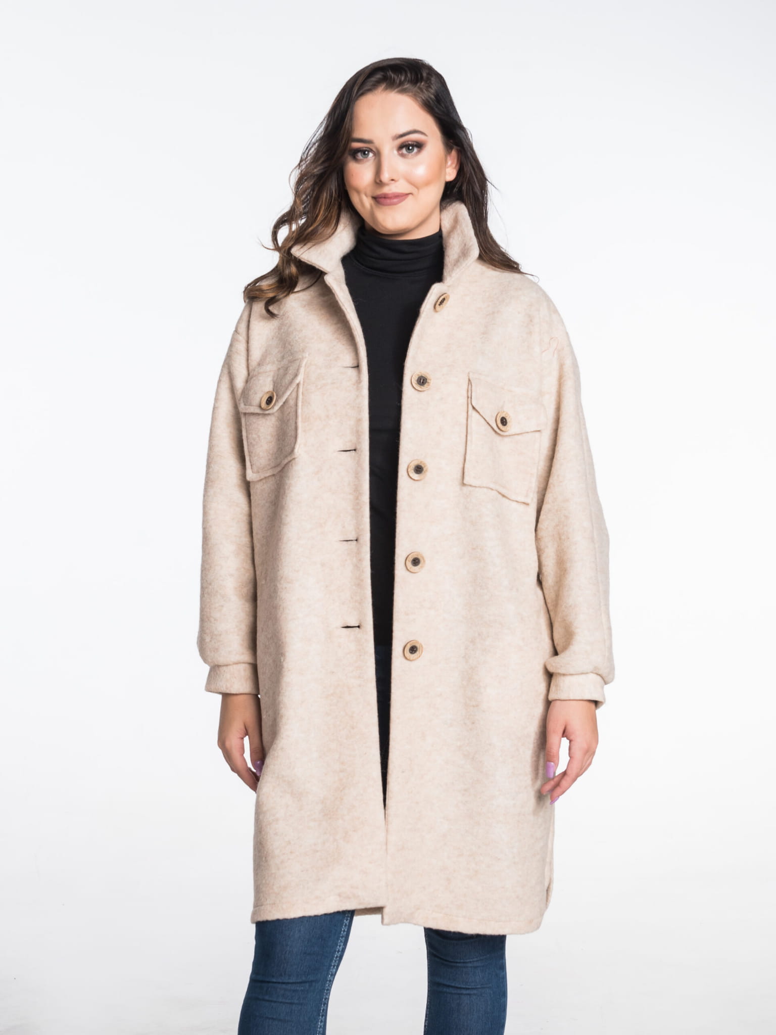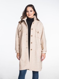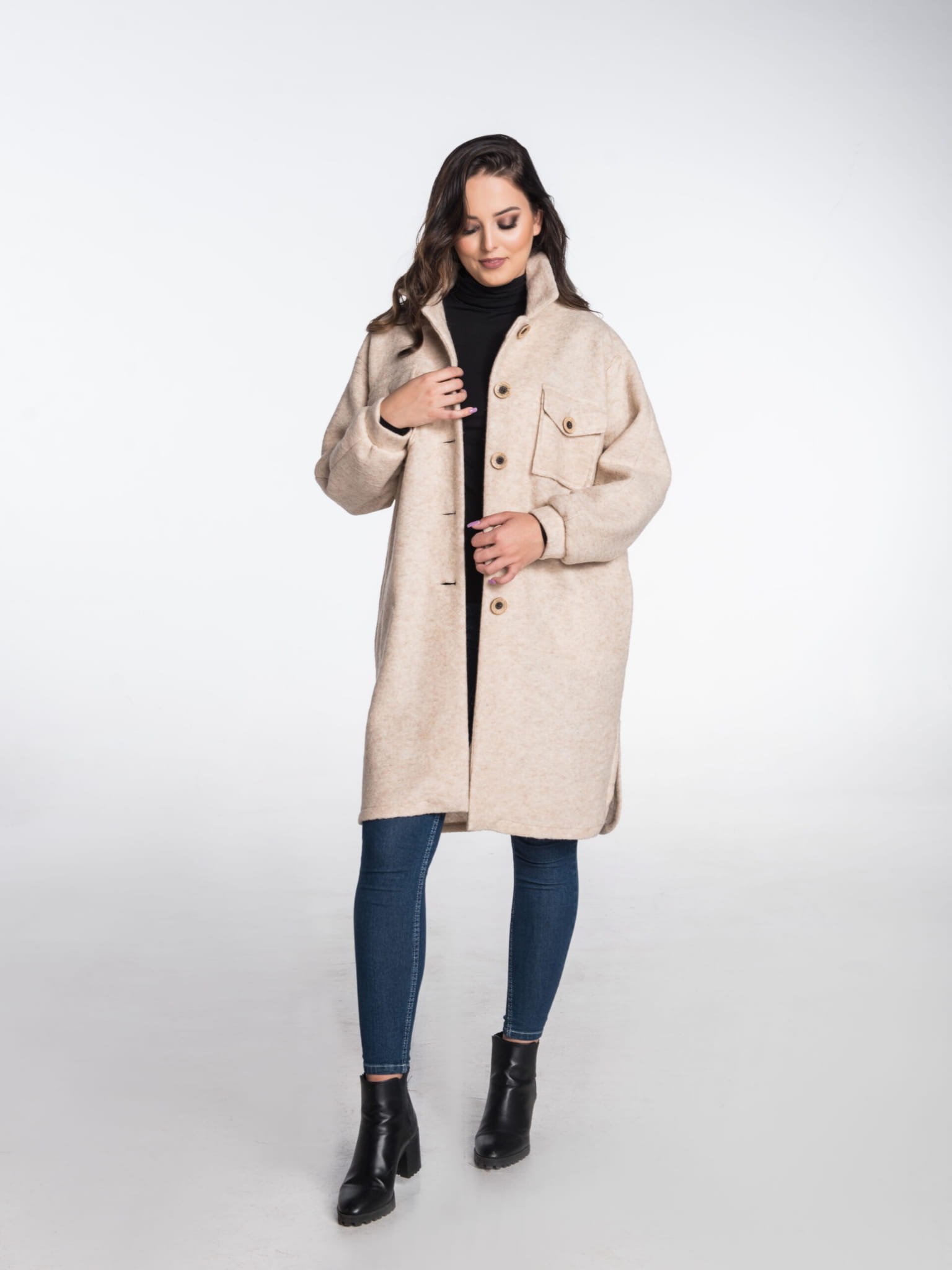 Wygodna i ciepła, długa koszula – płaszcz z przyjemnej 100% wełny w kolorze beżowym.