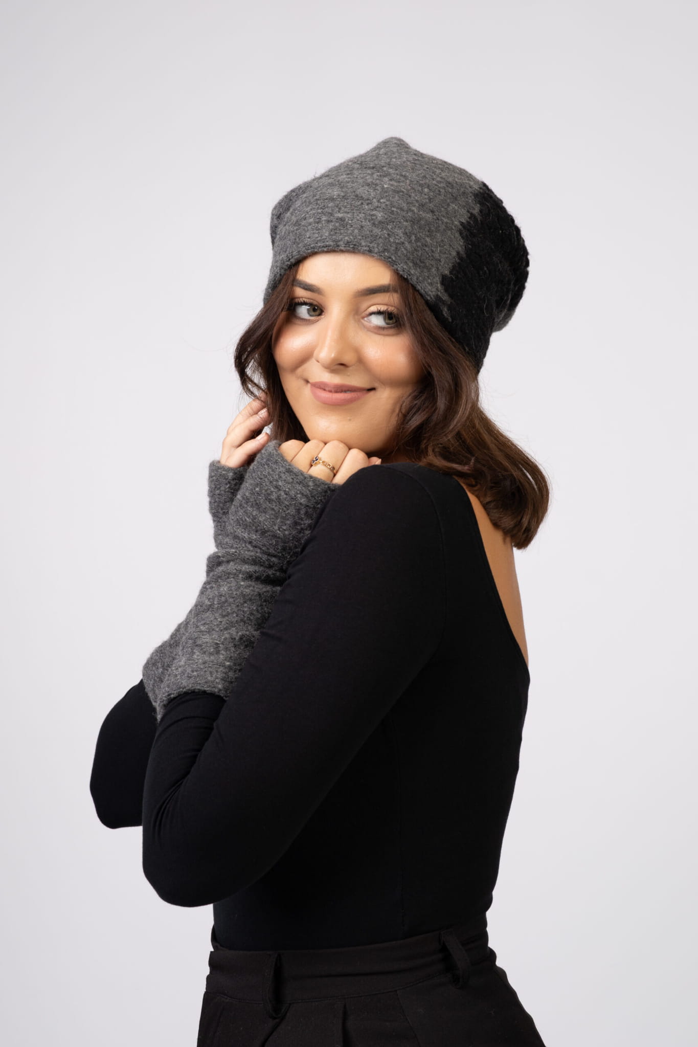 Stylowe i praktyczne mitenki z naturalnej wełny – ciepłe i praktyczne rękawiczki bez palców z naturalnej wełny w kolorze grafitowym.