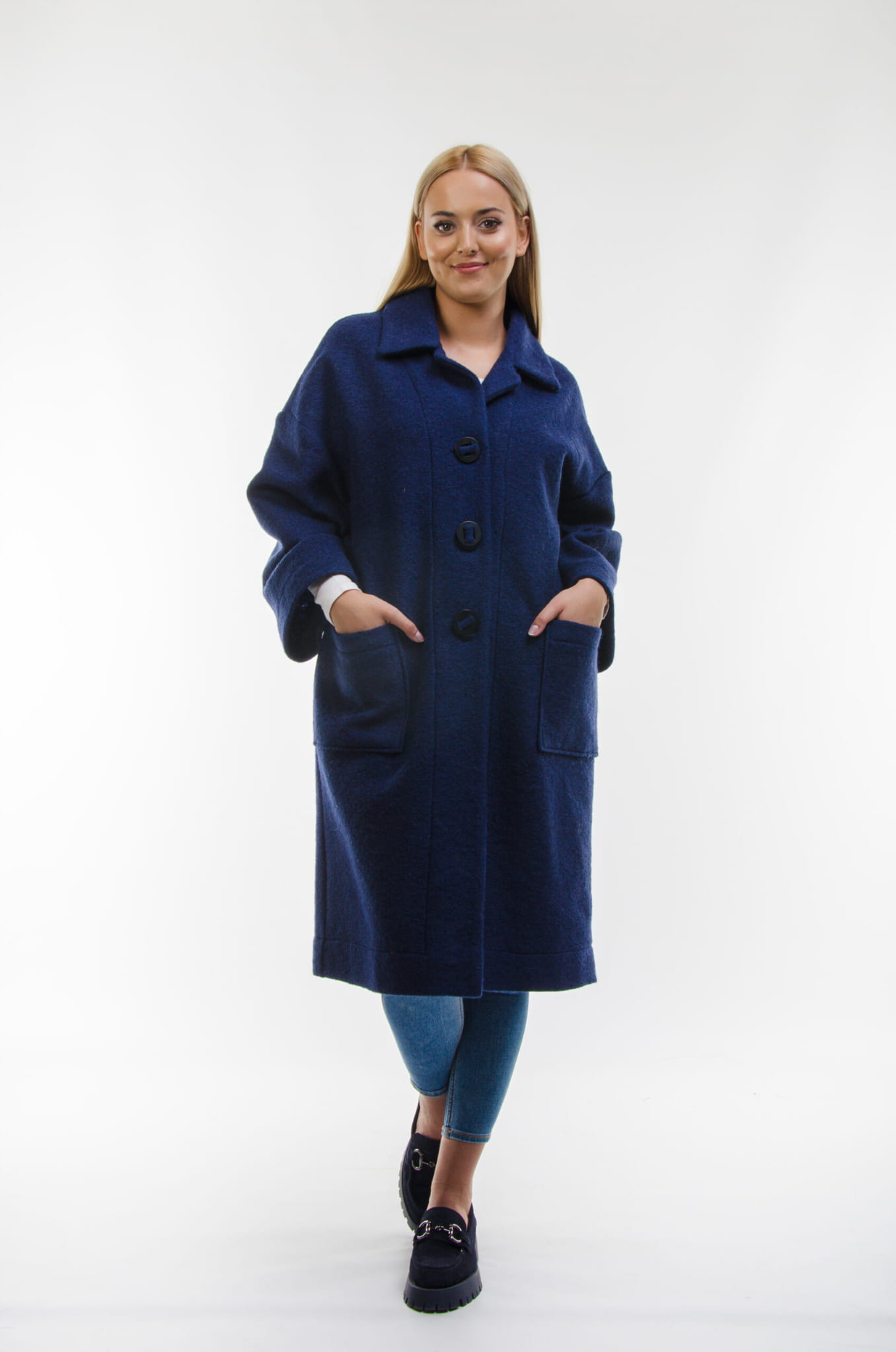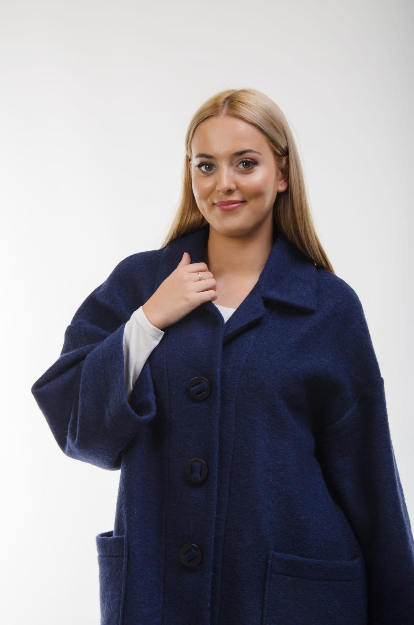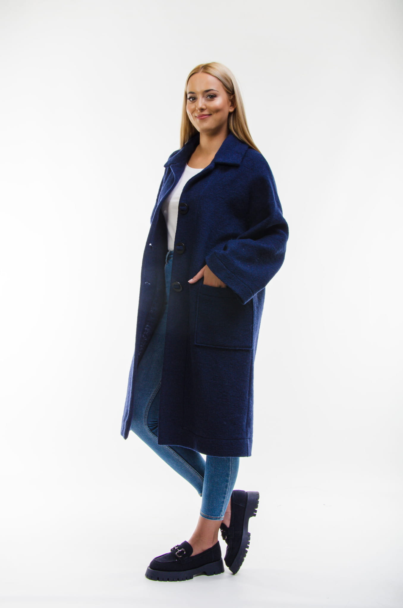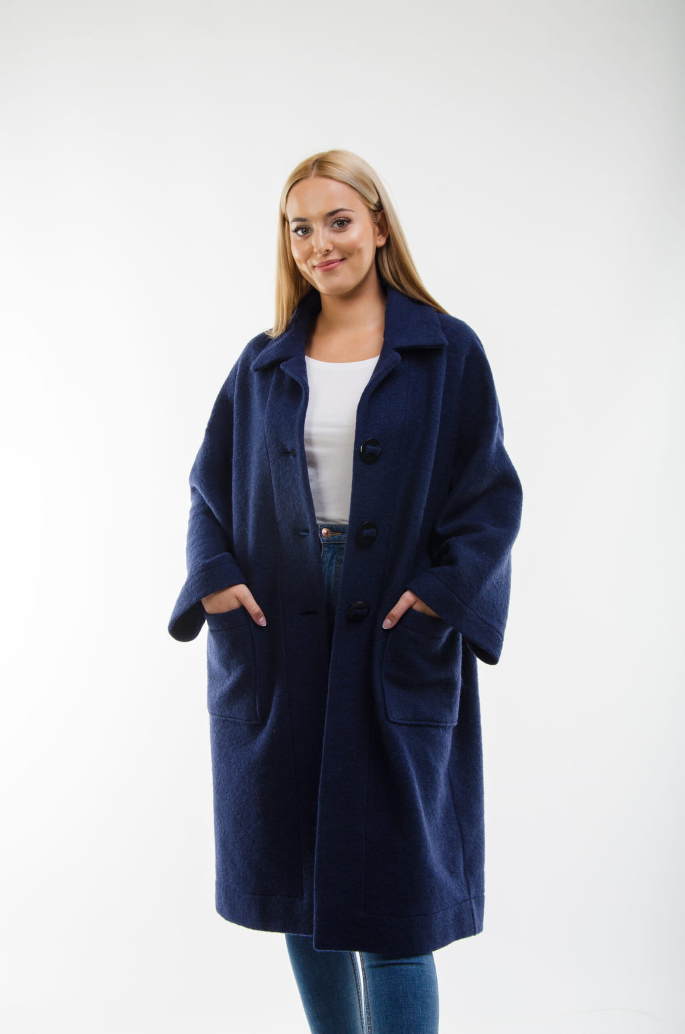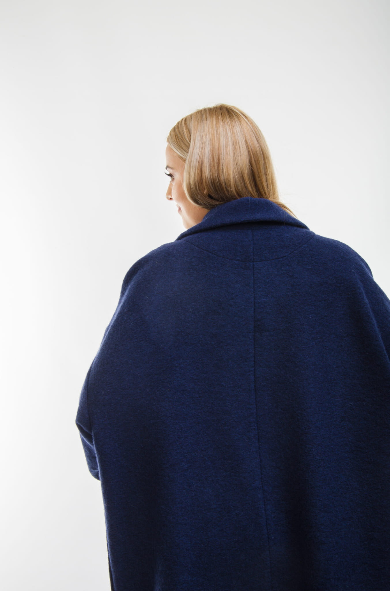 Wyjątkowo lekki, oversizowy płaszczyk ze 100% wełny w kolorze granatowym.
