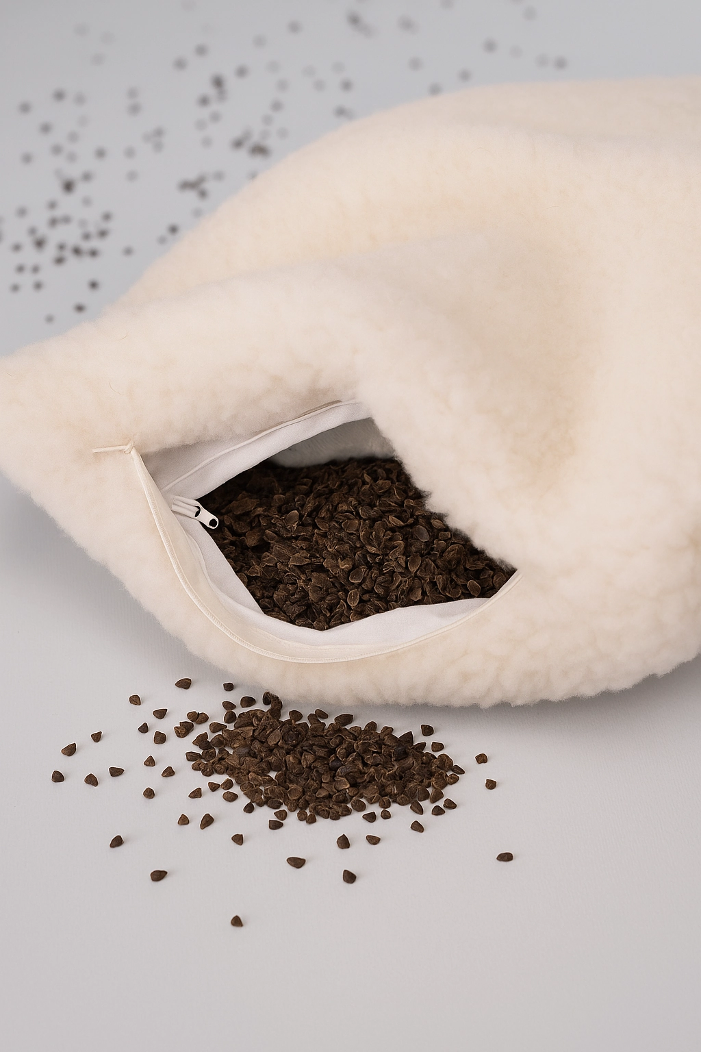 Wełniana poduszka z gryką. Doskonałe, prozdrowotne połącznie naturalnych materiałów.
